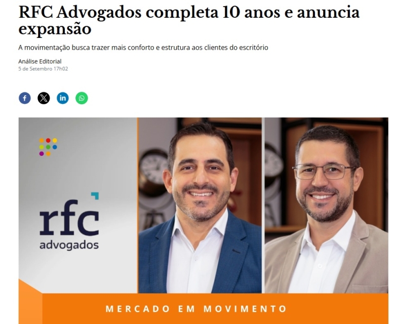RFC Advogados tem o orgulho de compartilhar mais uma conquista: fomos destaque na coluna "Mercado em Movimento" da Análise Editorial, celebrando nossa trajetória e anunciando a expansão do escritório.