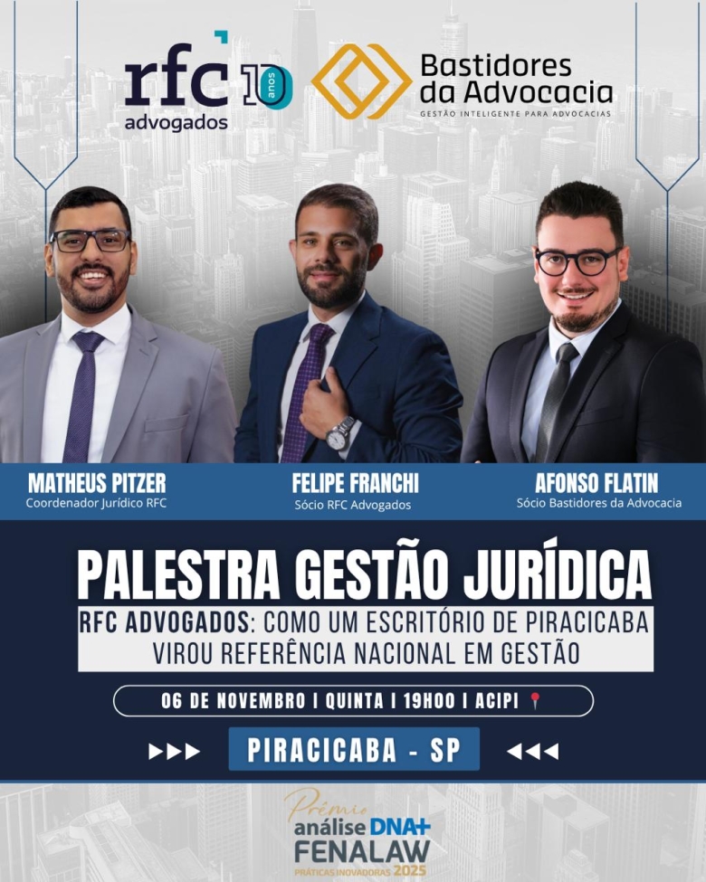 Após conquistar o Prêmio Análise DNA+ Fenalaw 2025 na categoria Gestão, o RFC Advogados, referência em advocacia empresarial em Piracicaba, apresenta a palestra “Gestão Jurídica — Como um escritório de Piracicaba virou referência nacional em gestão”.