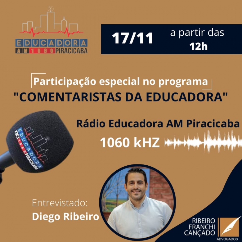 Na data de 17/11/21, o sócio e responsável pela área de direito do trabalho do escritório Ribeiro, Franchi e Cançado Advogados, será entrevistado ao vivo no Programa "COMENTARISTAS DA EDUCADORA" a partir das 12h na Rádio Educadora AM Piracicaba - 1060 KHz.