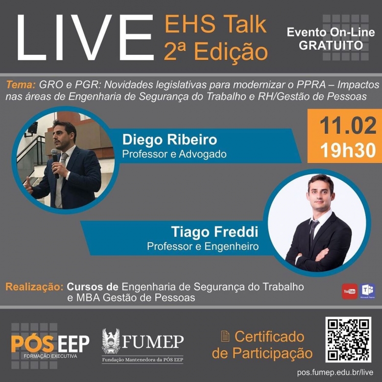 Na próxima 5a feira (11/02) nosso sócio Diego Ribeiro participará da live promovida pela Escola de Engenharia de Piracicaba - EEP, para debater sobre as mudanças na nossa legislação trabalhista, com a implementação do GRO e PGR em substituição ao PPRA das empresas, juntamente com o Professor Tiago Freddi.
