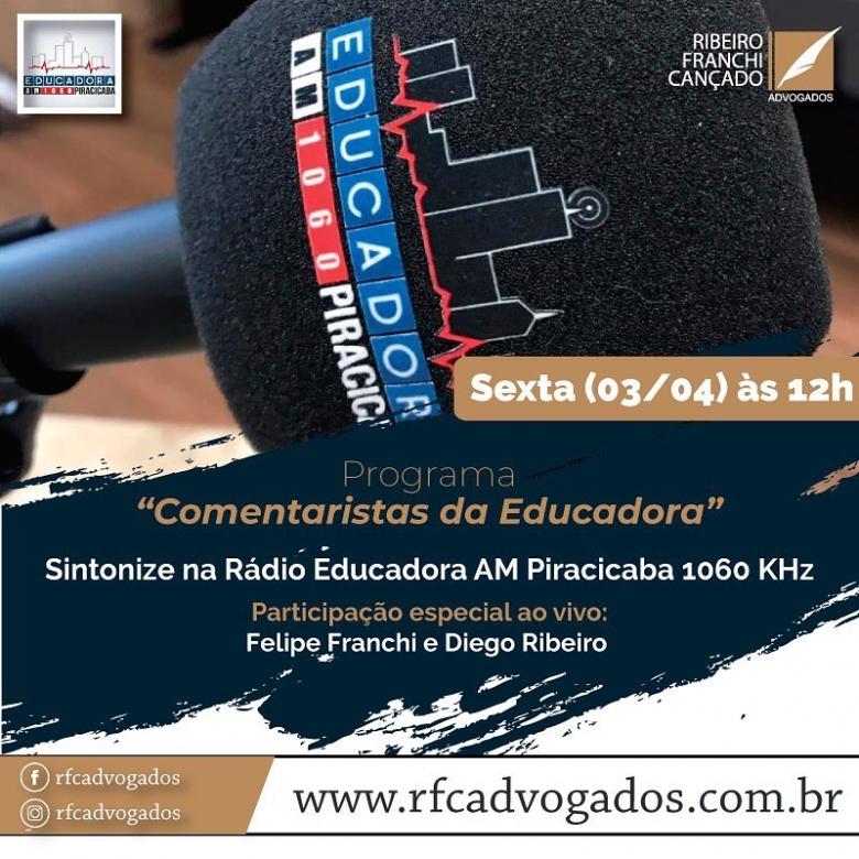 Acompanhe hoje às 12h, a participação ao vivo dos sócios do escritório Felipe Franchi e Diego Ribeiro no programa "Comentaristas da Educadora" pela rádio Educadora Piracicaba ou pelo site www.educadora1060.com.br ????